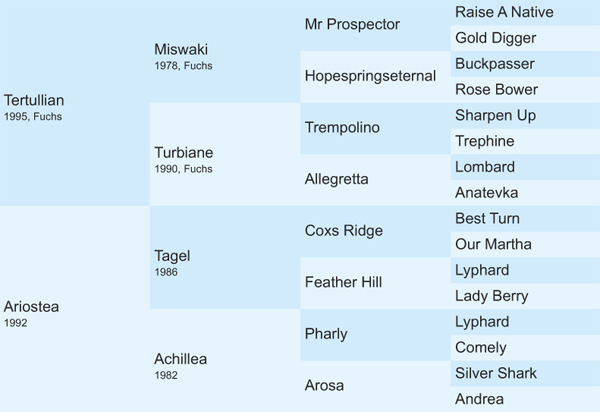 Sein Vater, der Schlenderhaner Deckhengst Tertullian xx gewann 12 Rennen und war ein Top-Sprinter. Seine Großmutter Allegretta wurde vom Gestüt Schlenderhan nach England verkauft und schrieb Zuchtgeschichte. Ihre Tochter Urban Sea gewann u.a. den Prix de l’Arc de Triomphe und brachte in der Zucht u. a. Galileo von Sadler’s Wells. Aus der Stutenfamilie stammen Hengste wie Armand (Holstein) Augustinus (Celle) oder Akitos (Warendorf).