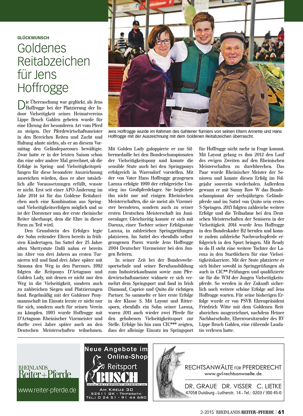 02.01.2015: Der Westfalen-Hengst Black Rock H konnte beim Turnier des Reiterverein Lippe-Bruch Gahlen e.V. in einer Springpferdeprüfung der Kl.A** überzeugen und gewinnt diese mit 8,4.